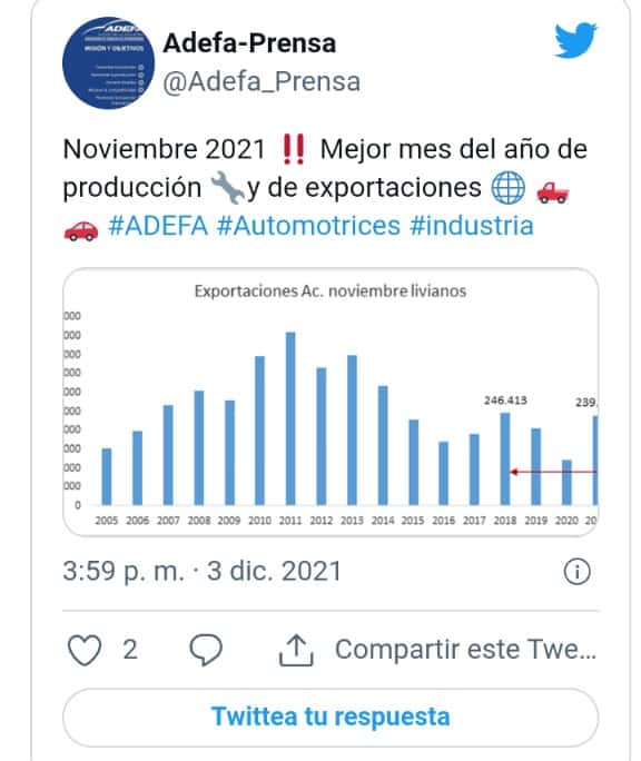 Asimismo, el sector contabilizó en noviembre 32.513 vehículos exportados, 25,3% más que en el mes anterior y 182,6% superior al volumen que se registró en noviembre del año pasado, agregó Adefa.