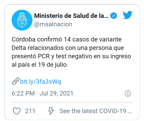La directora de epidemiología de la provincia, Laura López, dijo a medios locales que se debieron aislar “cinco burbujas” escolares por prevención por los hijos del hombre que ingresó la variante Delta a la ciudad de Córdoba”.