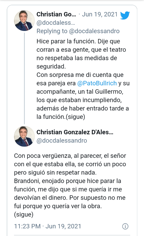 D’Alessandro contó que una pareja se sentó detrás suyo, sin respetar las medidas de seguridad. “Hice parar la función. Dije que corran a esa gente, que el teatro no respetaba las medidas de seguridad. Con sorpresa me di cuenta que esa pareja era Patricia Bullrich y su acompañante, un tal Guillermo, los que estaban incumpliendo, además de haber entrado tarde a la función”, recordó.