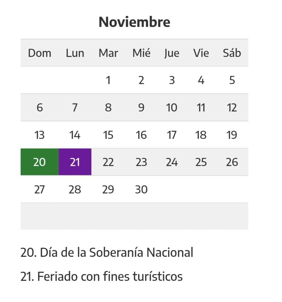 En tanto la semana entrante habrá feriado nacional puente los días domingo 20 y lunes 21 de noviembre.