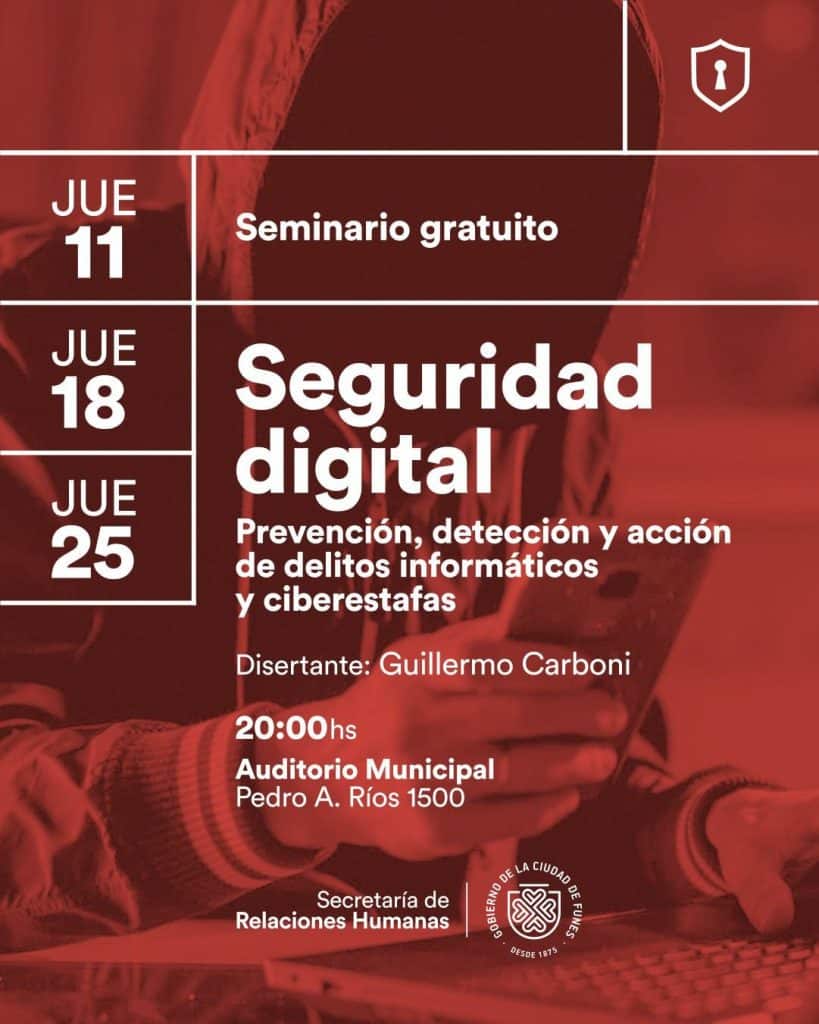 La Municipalidad de Funes anunció una nueva instancia de capacitación gratuita para los vecinos de la ciudad. En esta oportunidad se dictará un seminario de Ciberseguridad los días jueves 11, jueves 18 y jueves 25 a las 20hs en el Auditorio Municipal, ubicado en Pedro A Rios 1500.