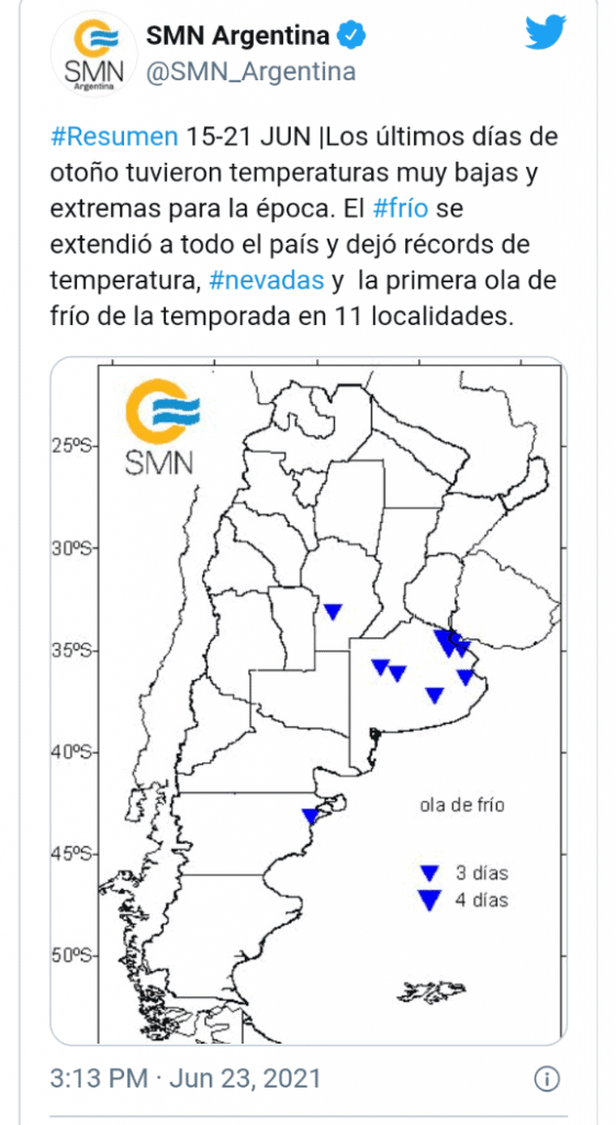 Nuevos récords de temperatura, nevadas y ola de frío fueron alcanzados durante la última semana del otoño a partir de una masa de aire muy fría en todo el país, que trajo temperaturas muy bajas y extremas para la época, informó el Servicio Meteorológico Nacional (SMN).
