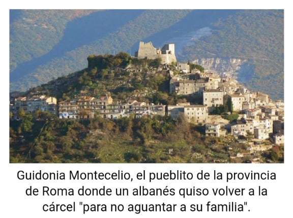 La escena mereció comentarios de todo tipo, y la mordacidad italiana tituló: “Meglio in carcere che ai domiciliari con la moglie. 30enne albanese evade da casa preferendo la galera” (Mejor en la cárcel que bajo arresto domiciliario con su esposa. Albanés de 30 años se escapa de su casa y prefiere ir a la cárcel) y aunque el nombre no trascendió, cuentan que fue este sábado cerca de la medianoche en Guidonia Monteceliola, un municipio cerca de Roma, de postal paradísica en la ladera de una montaña, donde las casas parecen apiladas y hay callecitas empedradas dignas de ensueño.